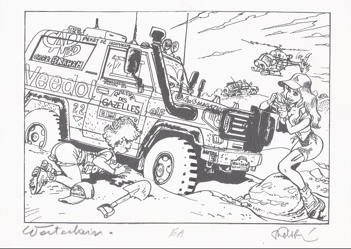 Commentaire : Le "Toyota Land Cruiser". Ex-libris faisant partie de la série "voiture". Ces ex-libris sont réalisés par différents auteurs : F. Walthéry pour les décors et les pin-up, le ou les autres auteurs pour la voiture et d'autres éléments. Ici, M. Wasterlain. Signé par les 2 auteurs. Existe en couleur.