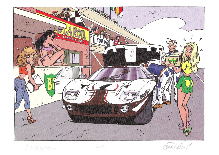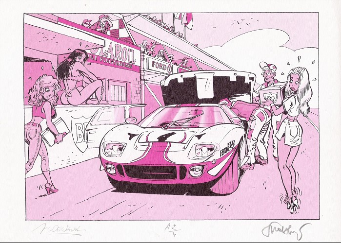 Commentaire : La "Ford GT40". Ex-libris faisant partie de la série "voiture" en couleur. Ces ex-libris sont réalisés par différents auteurs : F. Walthéry pour les décors et les pin-up, le ou les autres auteurs pour la voiture et d'autres éléments. Ici, Jean-Luc DELVAUX. Signé par les 2 auteurs.