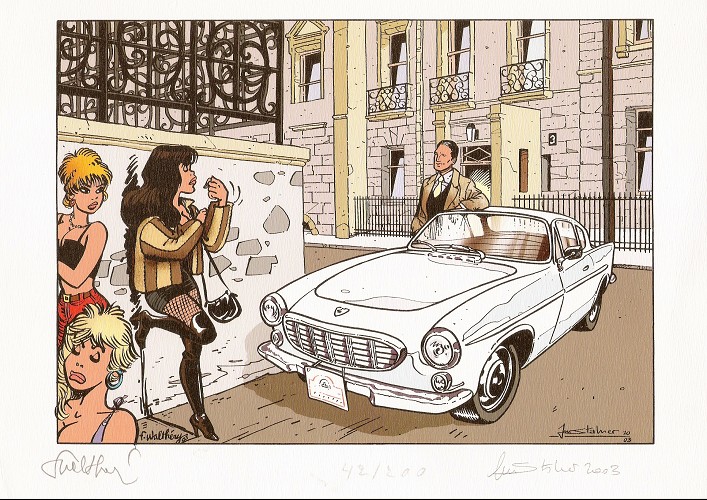 Commentaire : La "Volvo P1800". Ex-libris faisant partie de la série "voiture" en couleur. Ces ex-libris sont réalisés par différents auteurs : F. Walthéry pour les décors et les pin-up, le ou les autres auteurs pour la voiture et d'autres éléments. Ici, Jean-Marc Stalner. Signé par les 2 auteurs.