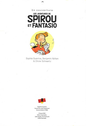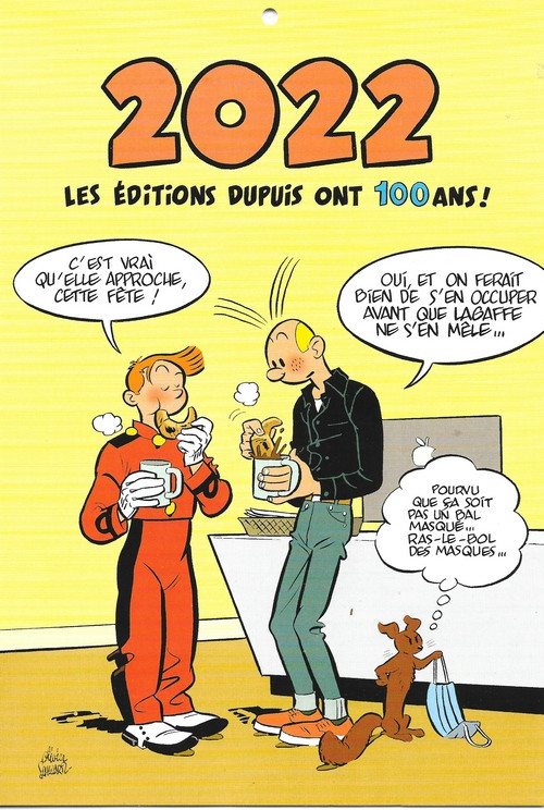 Commentaire : Calendrier offert avec le Spirou n°4368 du 29/12/2021. Dessinateurs et scénaristes : Janvier : Désert & Batem (Houba gags), Février : Boisvert & Colpron (Mort et déterré), Mars : Sergio Salma & Libon (Le strip dont vous êtes la star), Avril : Nod (Dad), Mai : Bocquet & Cossu (Frnck), Juin : Tebo (La méthode Raowl), Juillet : Kenny Ruiz (Team Phonix), Août : Théo Grosjean (Elliot au collège), Septembre : Cerq & Clémence Perrault (Léon & Lena), Octobre : Bocquet & Fabio Lai (Le métier le plus dangereux du monde), Novembre : Alibert, Lapière & Adrian (Le roi Louve), Décembre : Sti (Spoirou & Fantasperge), Couverture et dos : Sophie Guerrive, Benjamin Abitan & Olivier Schwartz (Spirou & Fantasio).