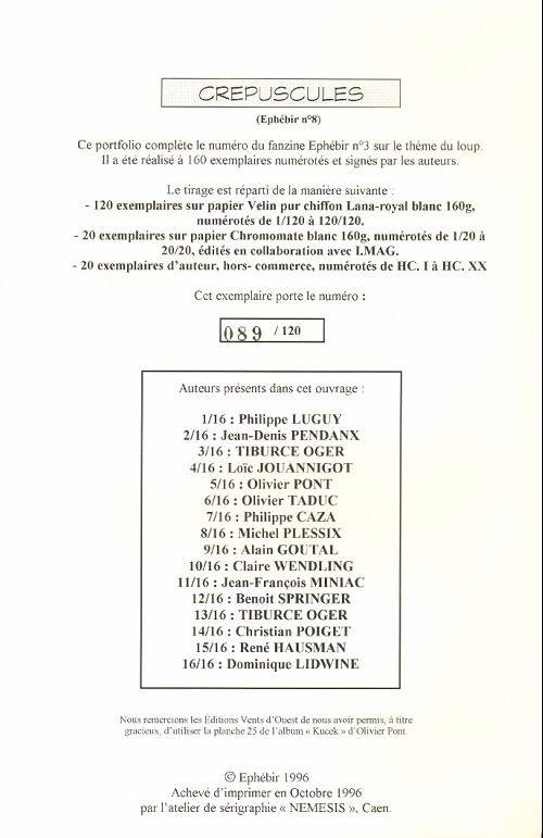 Commentaire : Co-réalisé et co-signé par Béatrice Tillier (Le Bois des vierges) et Olivier Brazao (Sheewöwkees). Verso non imprimé.