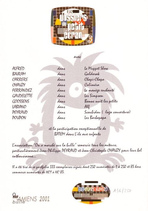 Commentaire : Portfolio réalisé par l'association On a marché sur la bulle, pour le 10ème festival d'Amiens. En souscription, prix préférenciel. Contient 12 illustrations en quadrichromie de dessins originaux, dont 11 signés.