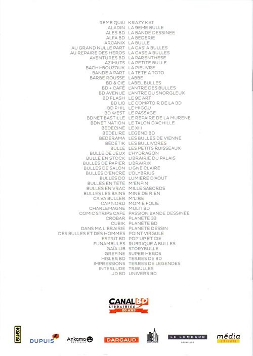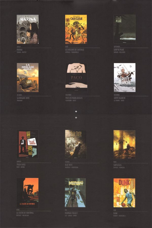 Commentaire : Illustrations : 01 - Brüno (Tyler Cross) 02 - Bourgoin (Blue Note) 03 - Munuera (Sortilèges) 04 - Rocheleau (La colère de Fantomas) 05 - Simon (Mermaid Project) 06 - Biancarelli (Dunk) 07 - Matteo (Marina) 08 - Tanquerelle (Les voleurs de Carthage) 09 - Pellejero (Loup de pluie) 10 - Marvano (La brigade juive) 11 - Sagot (Paco) 12 - Taduc (Griffe blanche)