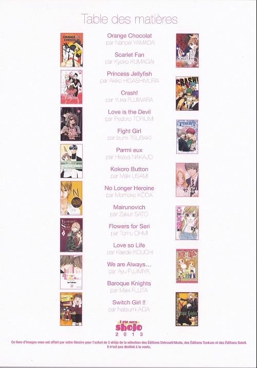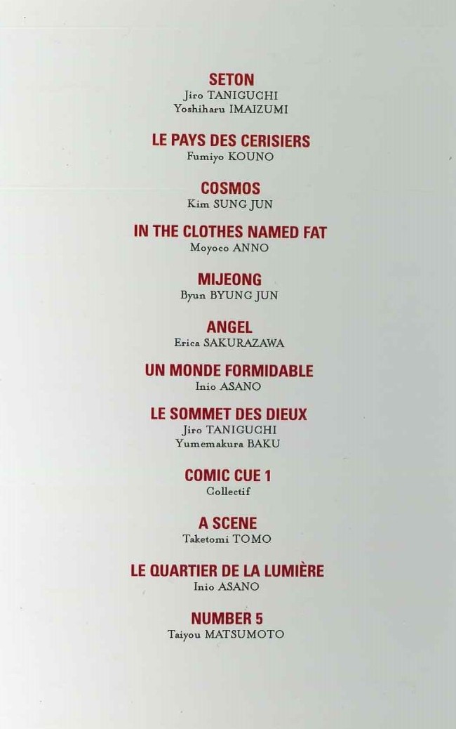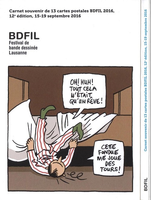 Commentaire : Illustrations : 01 - Ralph Meyer (Undertaker), 02 - Benn (Le Magicien de Whitechapel), 03 - Anaïs Depommier (Sartre), 04 - Mathieu Sapin (Élysée), 05 - Sébastien Piquet (Père et impairs), 06 - Erre, Fabrice (Guide sublime), 07 - Abel (Trish Trash), 08 - ALexandre Clérisse (L’Été Diabolik), 09 - Joël Parnotte (Le Maître d'armes), 10 - Jordi Labefre (Les Beaux Etés), 11 - Noelle Stevenson (Nimona), 12 - Julien Maffre (Stern).