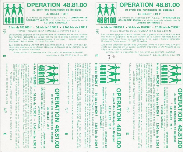 Commentaire : Planche de 4 autocollants. Au verso, il y a 4 tickets de tombola vendus par des bénévoles, tombola organisée par l'Opération 48.81.00 au profit des handicapés de Belgique et avec la participation de la Loterie Nationale. Fait partie d'un ensemble de 10 planches qui, assemblées, représentent la Belgique et ses sites remarquables (cf. visuel 2). Auteurs présents sur cette planche : Turk, De Groot, Leloup, Walthéry et Dany.