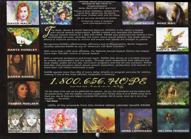 Commentaire : Calendrier de 15 mois de janvier 2005 à mars 2006. Couverture illustrée par Bill Sienkiewicz. Mois illusrés par Chris Moeller, Christophe Vacher, Lance Haun Rogue, David Mack, Ken Meyer Jr, Larry Macdougall et P.A. Lewis, Craig Elliott, Wendy Froud, Herb Leonhard, Daren Bader, Michael Kaluta, Mike May, Rantz Hoseley, Melissa Ferreira et Terese Nielsen.