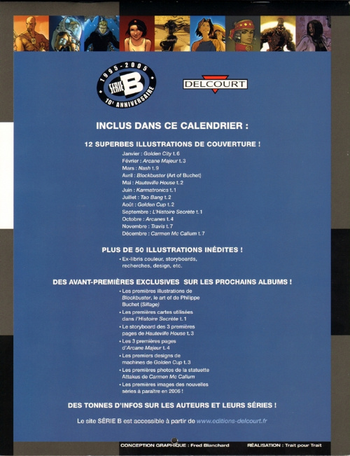 Commentaire : Contient des illustrations de couvertures d'albums du label Série B, par Nicolas Malfin (Golden City), Damien (Arcane majeur), Damour (Nash), Philippe Buchet (BlockBuster), Thierry Gioux et Manchu (Hauteville House), Fred Blanchard (Travis Karmatronics), Didier Cassegrain (Tao Bang), Alain Henriet (Golden Cup), Igor Kordey (L'Histoire secrète), Bojan Kovacevic (Arcanes), Christophe Quet (Travis), Gess (Carmen Mc Callum).