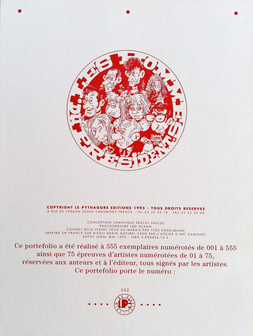Commentaire : Portfolio édité pour les 20 ans de Khani en 2005. Cette version avec toile bleue est une variante du tirage classique (toile orange) dont elle reprend les 21 illustrations (cf ID BEL 56647). Le justificatif de tirage reprend l'image de l'illustration de Franquin. Elle comporte une 22è illustration qui est l'illustration de Franquin en version noir et blanc.
