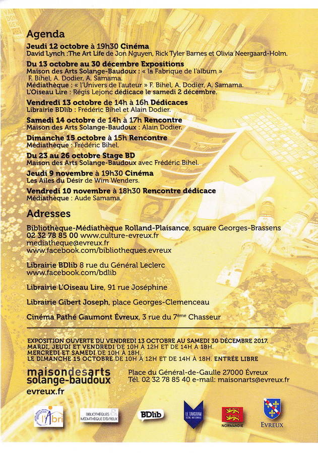 Commentaire : Evreux Portes de Normandie 2017 - Bandes Dessinées Auteurs : Frédéric Bihel - Alain Dodier - Aude Samama Programme 4 pages pour expositions Bandes Dessinées du 13 octobre au 30 décembre 2017
