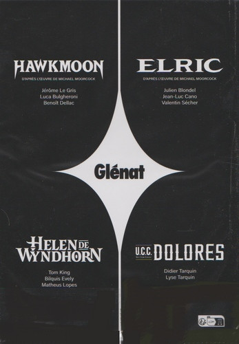 Commentaire : Carte reprenant 4 albums de la maison Glénat : Hawkmoon, Elric, Helene de Wyndhorn, et U.C.C. Dolores avec leur logo en feutrine.