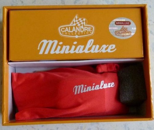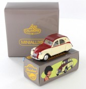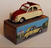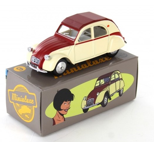 Commentaire : Pas de certificat. Cette miniature est une réplique au 1/43è d'une 2 CV de 1961, d'après la bande dessinée “2CV pour une égérie” des “Enquêtes auto de Margot”. Le modèle présente un aménagement intérieur, des phares ornés de cristaux Swarovski®, des jantes concaves en métal, un dessous en zamak. Versions avec la référence P09, en couleur jaune/rouge avec capote fermée. Un premier tirage a été lancé par Minialuxe début 2015 afin de présenter les Citroën 2 CV au Salon de la BD d’Angoulême; les miniatures, à châssis vissé, sont numérotées de 1 à 50 par référence. Le second tirage correspond à l'opération Calandre des éditions Paquet; les miniatures, à châssis riveté, sont numérotées de 1 à 3000 sur le dessous de la voiture et sont offertes pour l'achat de quatre albums des éditions Paquet (les vertes sont proposées dans les librairies Canal BD, les bleues dans les FNAC, et les rouges dans les autres librairies participantes). Les miniatures sont fournies dans une sur-boîte unitaire regroupant la miniature, enveloppée dans sa pochette, un tissus de nettoyage et sa boîte sécurisée.