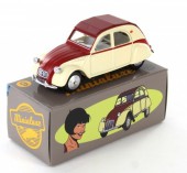 Commentaire : Pas de certificat. Cette miniature est une réplique au 1/43è d'une 2 CV de 1961, d'après la bande dessinée “2CV pour une égérie” des “Enquêtes auto de Margot”. Le modèle présente un aménagement intérieur, des phares ornés de cristaux Swarovski®, des jantes concaves en métal, un dessous en zamak. Versions avec la référence P08, en couleur jaune/rouge avec capote ouverte. Un premier tirage a été lancé par Minialuxe début 2015 afin de présenter les Citroën 2 CV au Salon de la BD d’Angoulême; les miniatures, à châssis vissé, sont numérotées de 1 à 50 par référence. Le second tirage correspond à l'opération Calandre des éditions Paquet; les miniatures, à châssis riveté, sont numérotées de 1 à 3000 sur le dessous de la voiture et sont offertes pour l'achat de quatre albums des éditions Paquet. Les miniatures sont fournies dans une sur-boîte unitaire regroupant la miniature, enveloppée dans sa pochette, un tissus de netoyage et sa boîte sécurisée.