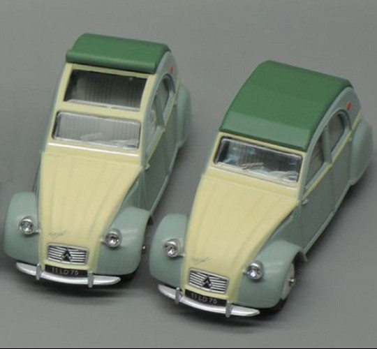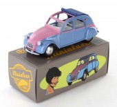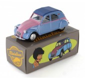 Commentaire : Pas de certificat. Cette miniature est une réplique au 1/43e d'une 2 CV de 1961, d'après la bande dessinée “2CV pour une égérie” des “Enquêtes auto de Margot”. Le modèle présente un aménagement intérieur, des phares ornés de cristaux Swarovski®, des jantes concaves en métal, un dessous en zamak. Version avec la référence P13, en couleur rose/bleue avec capote fermée. Un premier tirage a été lancé par Minialuxe début 2015 afin de présenter les Citroën 2 CV au Salon de la BD d’Angoulême; les miniatures, à châssis vissé, sont numérotées de 1 à 50 par référence. Le second tirage correspond à l'opération Calandre des éditions Paquet; les miniatures, à châssis riveté, sont numérotées de 1 à 3000 sur le dessous de la voiture et sont offertes pour l'achat de quatre albums des éditions Paquet (les vertes sont proposées dans les librairies Canal BD, les bleues dans les FNAC, et les rouges dans les autres librairies participantes). Les miniatures sont fournies dans une sur-boîte unitaire regroupant la miniature, enveloppée dans sa pochette, un tissus de nettoyage et sa boîte sécurisée.