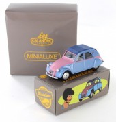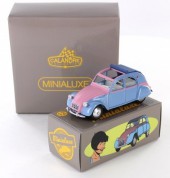 Commentaire : Pas de certificat. Cette miniature est une réplique au 1/43e d'une 2 CV de 1961, d'après la bande dessinée “2CV pour une égérie” des “Enquêtes auto de Margot”. Le modèle présente un aménagement intérieur, des phares ornés de cristaux Swarovski®, des jantes concaves en métal, un dessous en zamak. Version avec la référence P12, en couleur rose/bleue avec capote ouverte. Un premier tirage a été lancé par Minialuxe début 2015 afin de présenter les Citroën 2 CV au Salon de la BD d’Angoulême; les miniatures, à châssis vissé, sont numérotées de 1 à 50 par référence. Le second tirage correspond à l'opération Calandre des éditions Paquet; les miniatures, à châssis riveté, sont numérotées de 1 à 3000 sur le dessous de la voiture et sont offertes pour l'achat de quatre albums des éditions Paquet (les vertes sont proposées dans les librairies Canal BD, les bleues dans les FNAC, et les rouges dans les autres librairies participantes). Les miniatures sont fournies dans une sur-boîte unitaire regroupant la miniature, enveloppée dans sa pochette, un tissus de nettoyage et sa boîte sécurisée.