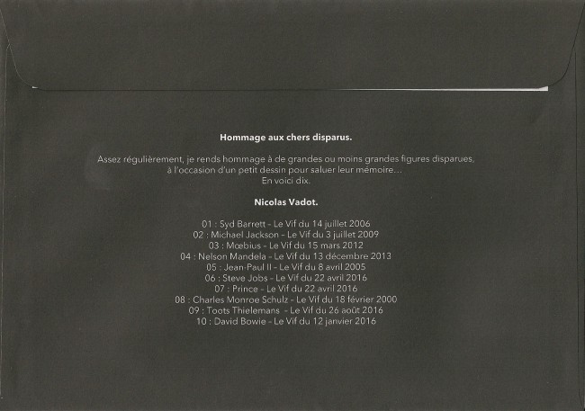 Commentaire : Enveloppe contenant 10 Illustrations de Nicolas Vadot. Édité dans le cadre du financement participatif de l'album "Marrons-nous". Offert aux édinautes du palier 50€.