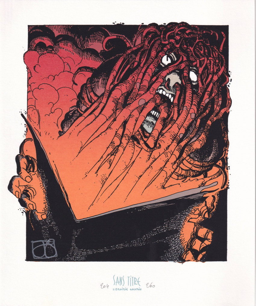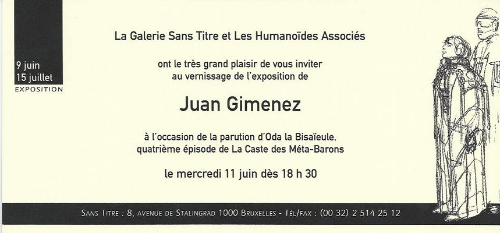 Commentaire : Invitation au vernissage de l'exposition de Juan Gimenez à l'occasion de la parution d'Oda la Bisaïeule, vernissage le mercredi 11 juin.