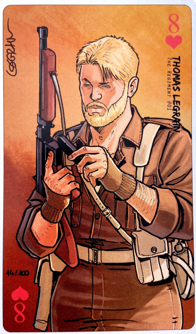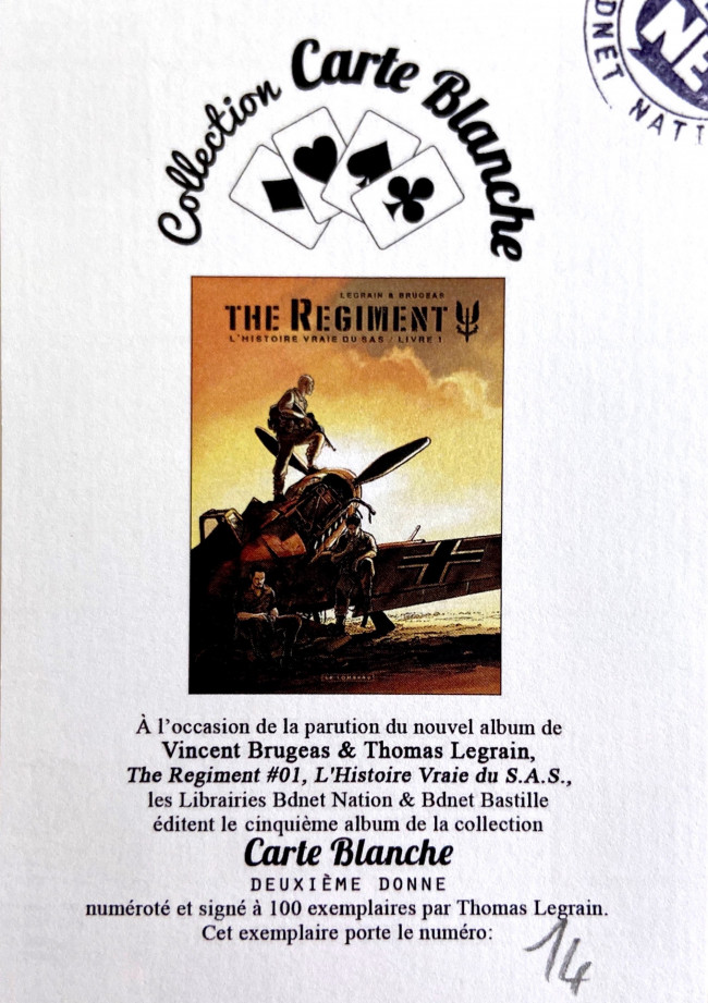 Commentaire : Carte à jouer numérotée et signée, faisant partie d'un ensemble de 78 cartes nommé "Carte Blanche - Deuxième donne". Ces cartes sont éditées à 100 exemplaires chacune, sont liées à un album précis et 1 carte supplémentaire est réservée aux abonnés à la collection. Ces cartes sont mises dans la catégorie Carte (et non Jeux) car reliées spécifiquement à un album dans lequel est inséré un certificat correspondant à la carte portant le même numéro.