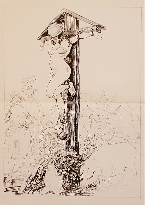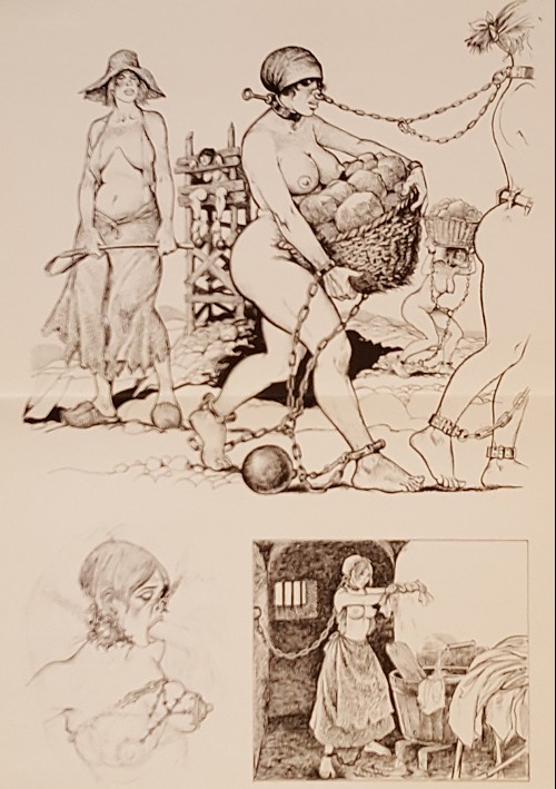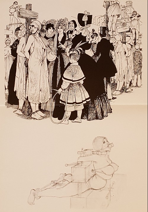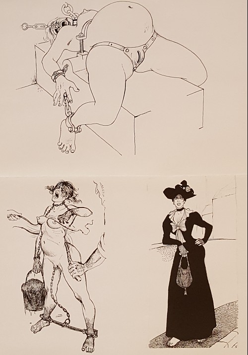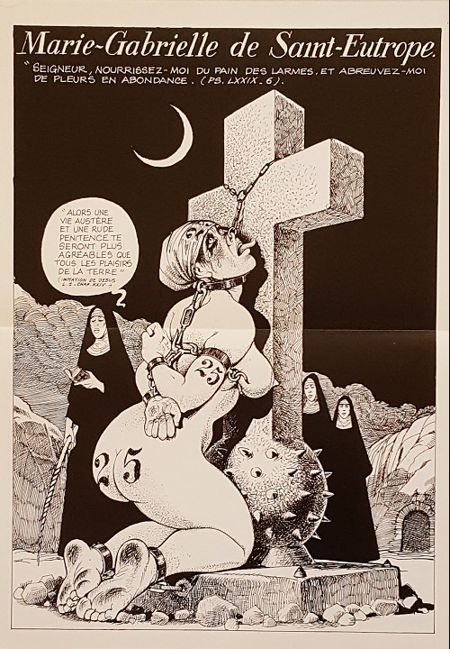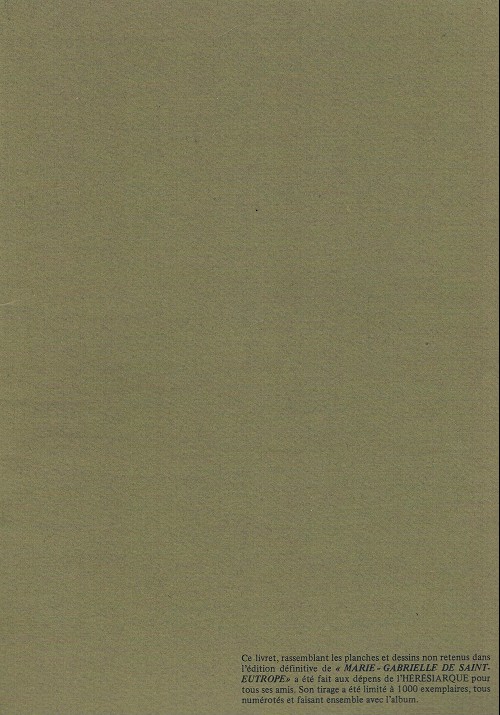 Commentaire : Ce portfolio rassemble 8 illustrations (pliées en 2) non retenues dans l'édition définitive de "Marie-Gabrielle de Saint-Eutrope". Le format des planches est de 30 cm x 43 cm. La numérotation de chaque exemplaire es située sur le rabat intérieur du portfolio.