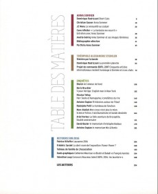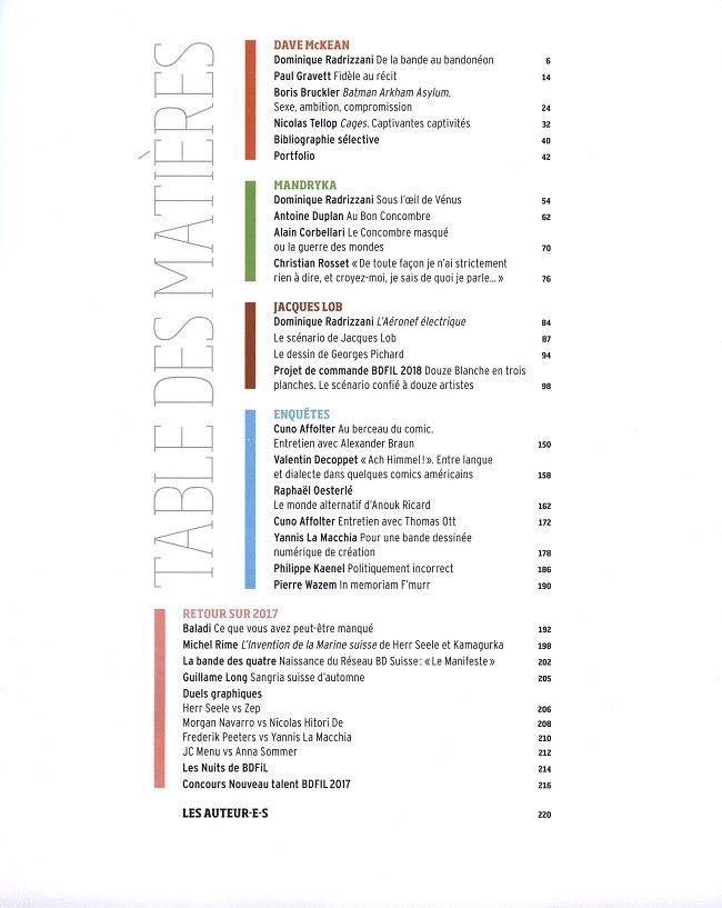 Trois dossiers composent ce nouveau numéro. Le premier consacré à l’univers graphique de Dave McKean, le second au Concombre masqué de Mandryka et le troisième à L’Aéronef électrique de Jacques Lob (1932-1990), un scénario inédit soumis successivement au dessin de : David B., Paolo Bacilieri, Dominique Bertail, Blutch, Joko, Yannis La Macchia, Mandryka, Catherine Meurisse, Frederik Peeters, René Pétillon, Jean Solé et Emilio Van der Zuiden. Des enquêtes, qui vous immergent dans les newspapers américains, dans l’humour déjanté d’Anouk Ricard, dans un projet pionnier de BD numérique de création… Sans oublier L’Invention de la Marine suisse de Herr Seele et Kamagurka, la Route 66 avec Thomas Ott, un manifeste du Réseau BD Suisse et 6 planches inédites de Baladi. Sans oublier tout le reste aussi.