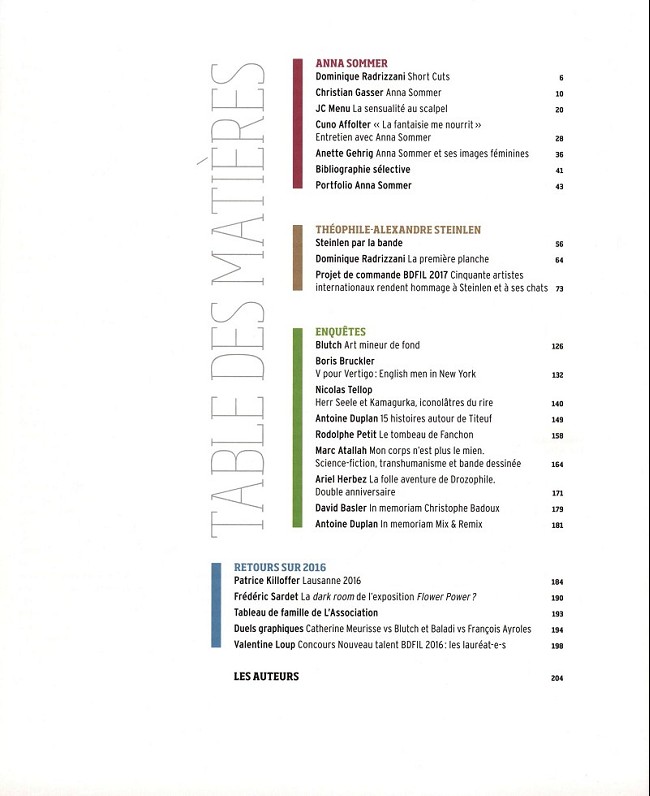 Sommaire : ISBN: 978-2-88250-475-3 Revue suisse éditée à l'occasion du Festival international de bande dessinée de Lausanne (BDFIL). Parution annuelle. Thèmes du numéro 3 (2017): - Dossier Anna Sommer - Dossier Théophile-Alexandre Steinlen - Blutch, Killofer, Herr Seele - Le double anniversaire de Drozophile - Hommage à Christophe Badoux - Hommage à Mix et Remix.