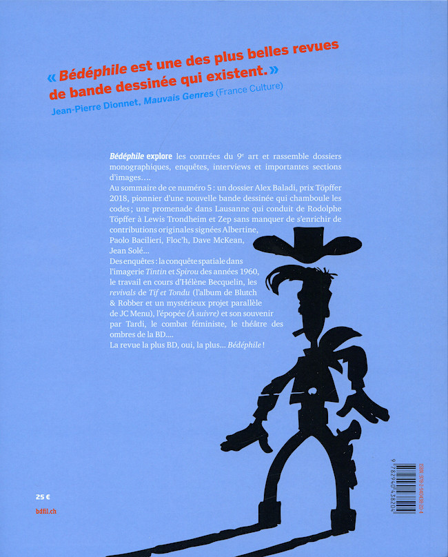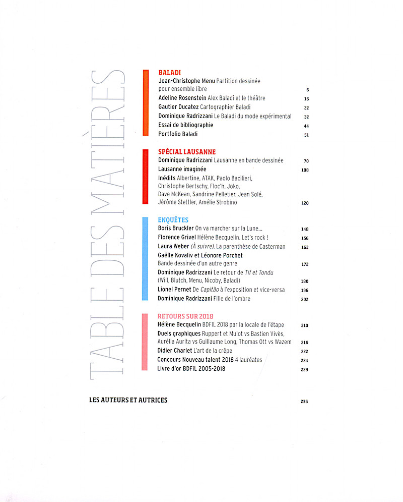 Sommaire : ISBN : 978-2-940438-20-4 Format 197 x 245 mm. Parution à l'occasion de la 15e édition du Festival international de bande dessinée de Lausanne (BDFIL) du 12 au 16 septembre 2019.