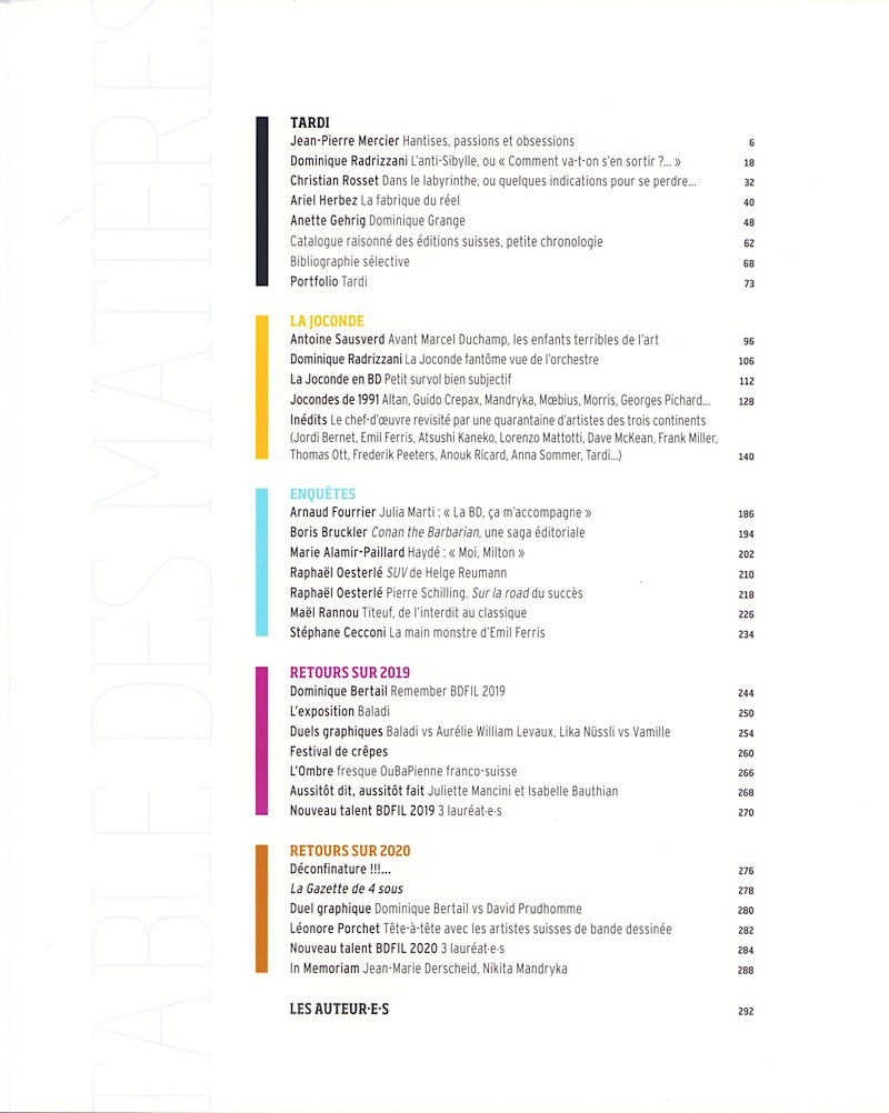 Sommaire : ISBN : 978-2-940438-21-1. Format 195 x 245 mm. Parution à l'occasion de la 16e édition du Festival international de bande dessinée de Lausanne (BDFIL) prévue en 2020 et reportée du 16 au 20 septembre 2021.