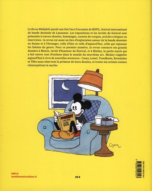 Sommaire : ISBN: 978-2-88250-394-7 En coédition avec les éditions Noir sur Blanc à Lausanne, BDFIL a lancé sa revue annuelle, parue à l’heure du festival 2015. Réunissant dessins, hommages, carnets de croquis, interviews ou articles critiques, elle reflète le festival, mais pas que. Pour ce premier numéro, elle consacre ses grands dossiers à Blutch qui lui a ouvert son laboratoire secret, à Pierre Strinati, à Mickey qui a fait entrer tant d’enfants dans le monde du neuvième art. Au moment où la souris malicieuse s’apprête à vivre de nouvelles aventures grâce à Cosey, Loisel ou Tébo qui nous ont réservé la primeur de leurs dessins, trente-six artistes suisses (de Adam jusqu’à Zep) lui tirent le portrait. La Revue Bédéphile s’intéresse aux classiques et aux modernes, aux productions nationale et internationale, aux événements plus faciles ou plus exigeants. Elle aime la BD. Thèmes du numéro 1 (2015): - Dossier Blutch, - Pierre Strinati, pionnier de la renaissance du 9e art, - Mickey: la renaissance d'un mythe.
