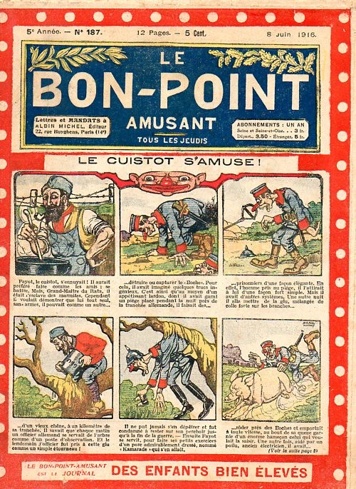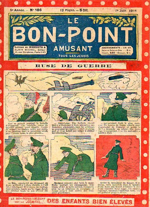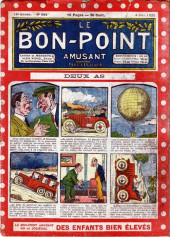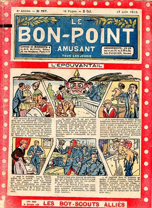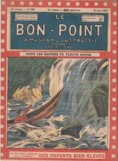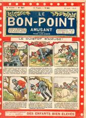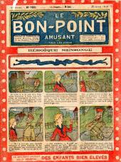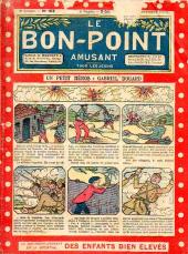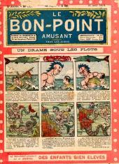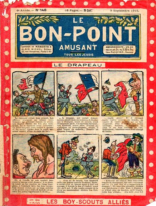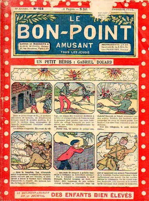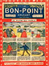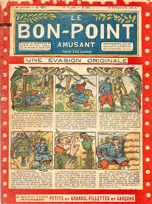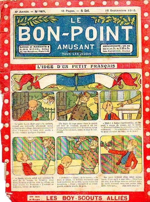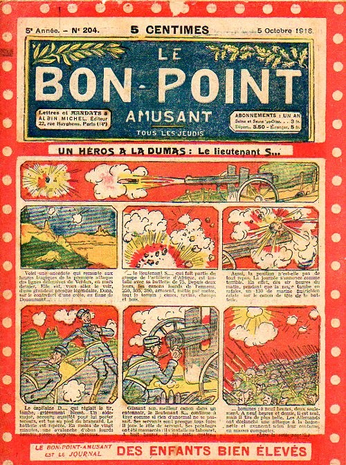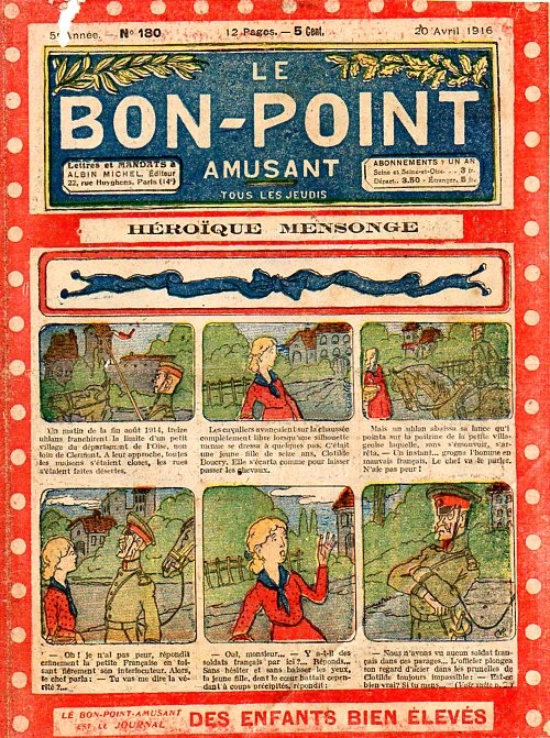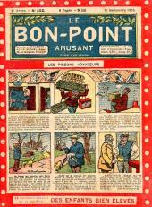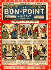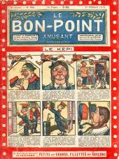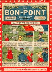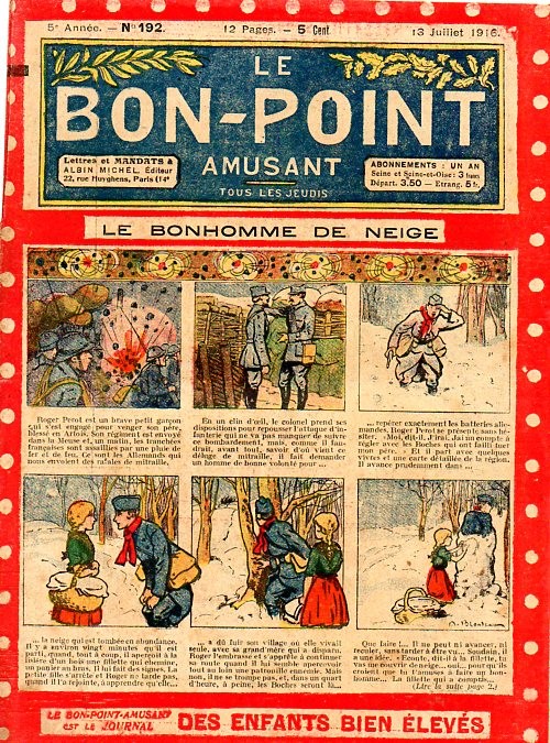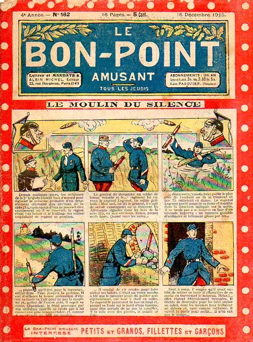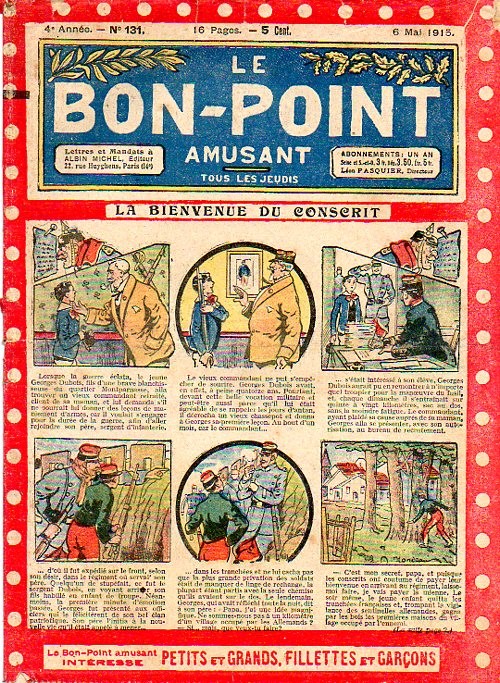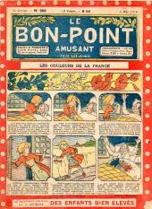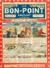 Sommaire : 04.07.1912 (n°1) au 16.06.1938 (n°1333) Le Bon point amusant, qui deviendra secondairement « et instructif ! » est une petite revue hebdomadaire pour enfant créée par Albin Michel en 1911. Le récit : Un Tour du monde en aéroplane, écrit par le Comte Henri de la Vaulx et Arnould Galopin, est paru en feuilleton dans ce périodique. Ce périple a un tel succès qu’il devient ensuite un livre de lecture courante, illustré de six cent trente dessins de Fillol et encore publié en 1928. Arnould Galopin, auteur apprécié du journal, publie encore dans Le Bon point amusant, Le Petit Mousse (1928) ou bien, Aventures d’un Petit Explorateur, en 1934, quatre ans avant la disparition de l’hebdomadaire remplacé par le magazine Francis, publication éphémère qui échoue dans ses tentatives de modernisation. À noter le trés fort caractère propagandiste. (les titres sont notés tels quels) n°131 : - La bienvenue du conscript. - Gringalet (grand roman dramatique inédit par Pierre Guillon). - Initiative d'un jeune poilu. - Jacques, l'enfant trouvé. - Dans les ténèbres. - Red Fly, le cow-Boy rouge, par Teddy Smith. - Histoire des nez. - Petit Soldat de la Grande Guerre. Roman héroïque par Blanche Petithuguenin. - Page patriotique : L'espion brocanteur. - Til l'Espiegle XXXV. Hue Cocotte.