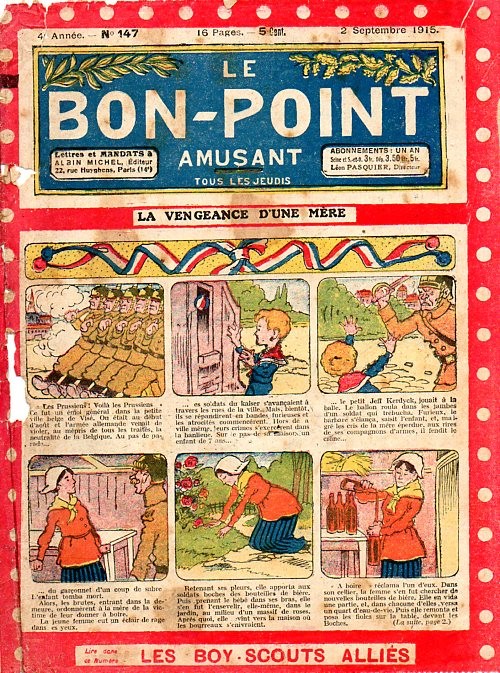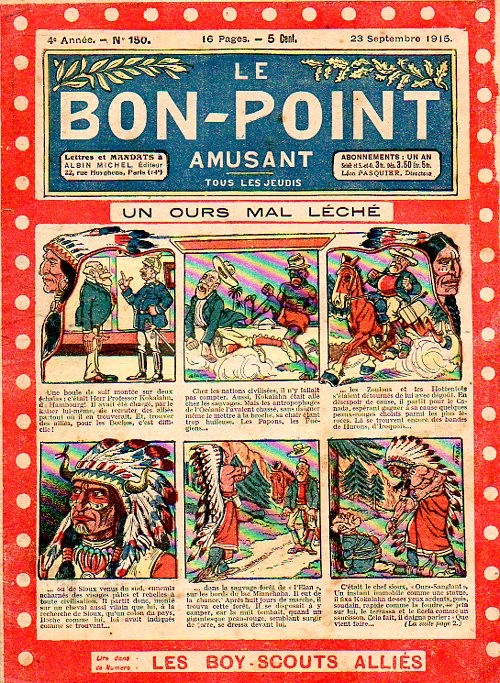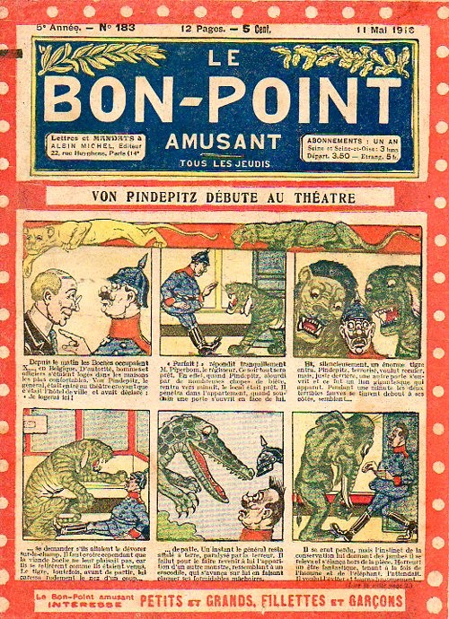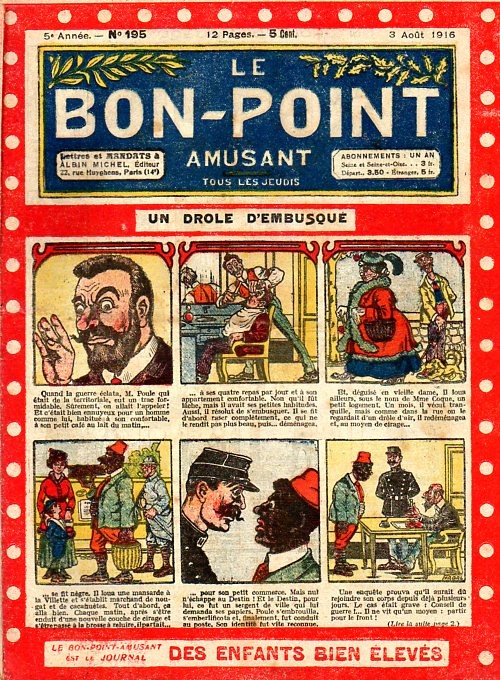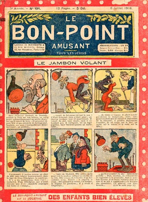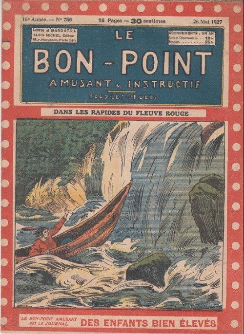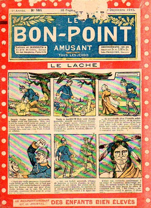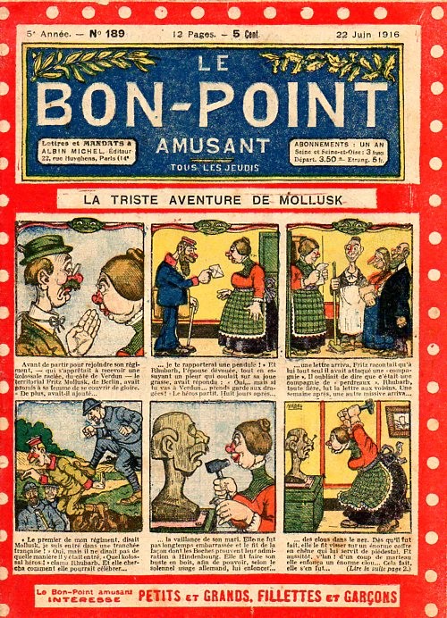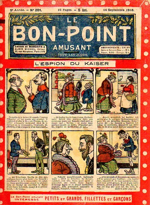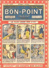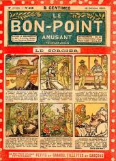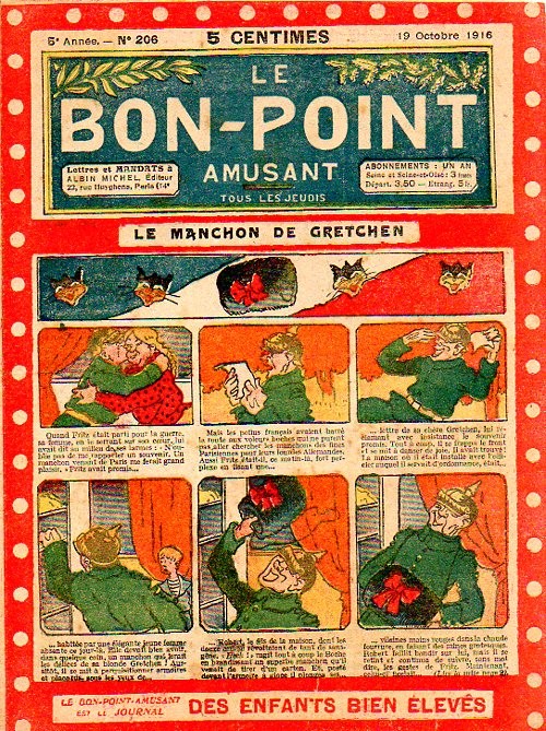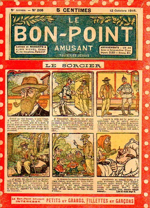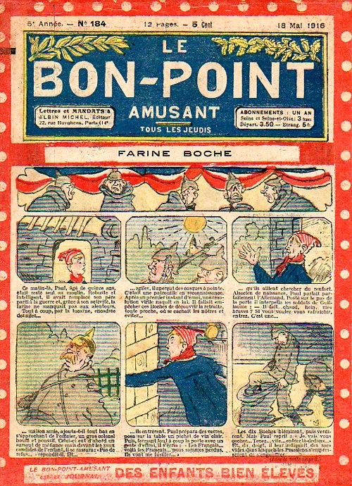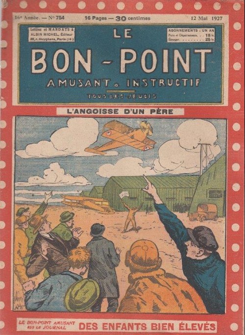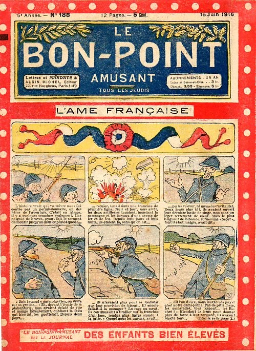 Sommaire : 04.07.1912 (n°1) au 16.06.1938 (n°1333) Le Bon point amusant, qui deviendra secondairement « et instructif ! » est une petite revue hebdomadaire pour enfant créée par Albin Michel en 1911. Le récit : Un Tour du monde en aéroplane, écrit par le Comte Henri de la Vaulx et Arnould Galopin, est paru en feuilleton dans ce périodique. Ce périple a un tel succès qu’il devient ensuite un livre de lecture courante, illustré de six cent trente dessins de Fillol et encore publié en 1928. Arnould Galopin, auteur apprécié du journal, publie encore dans Le Bon point amusant, Le Petit Mousse (1928) ou bien, Aventures d’un Petit Explorateur, en 1934, quatre ans avant la disparition de l’hebdomadaire remplacé par le magazine Francis, publication éphémère qui échoue dans ses tentatives de modernisation. À noter le trés fort caractère propagandiste. (les titres sont notés tels quels) n°131 : - La bienvenue du conscript. - Gringalet (grand roman dramatique inédit par Pierre Guillon). - Initiative d'un jeune poilu. - Jacques, l'enfant trouvé. - Dans les ténèbres. - Red Fly, le cow-Boy rouge, par Teddy Smith. - Histoire des nez. - Petit Soldat de la Grande Guerre. Roman héroïque par Blanche Petithuguenin. - Page patriotique : L'espion brocanteur. - Til l'Espiegle XXXV. Hue Cocotte.