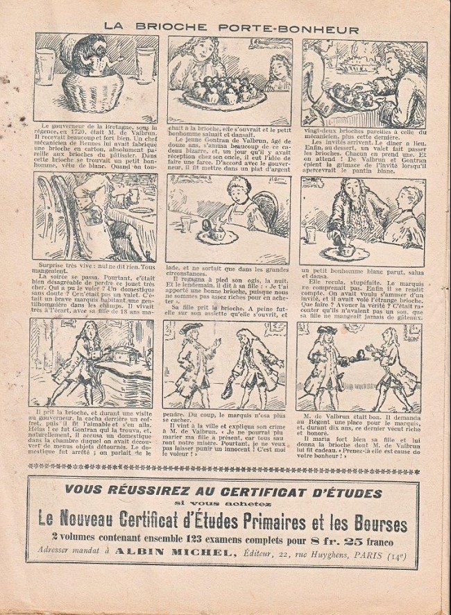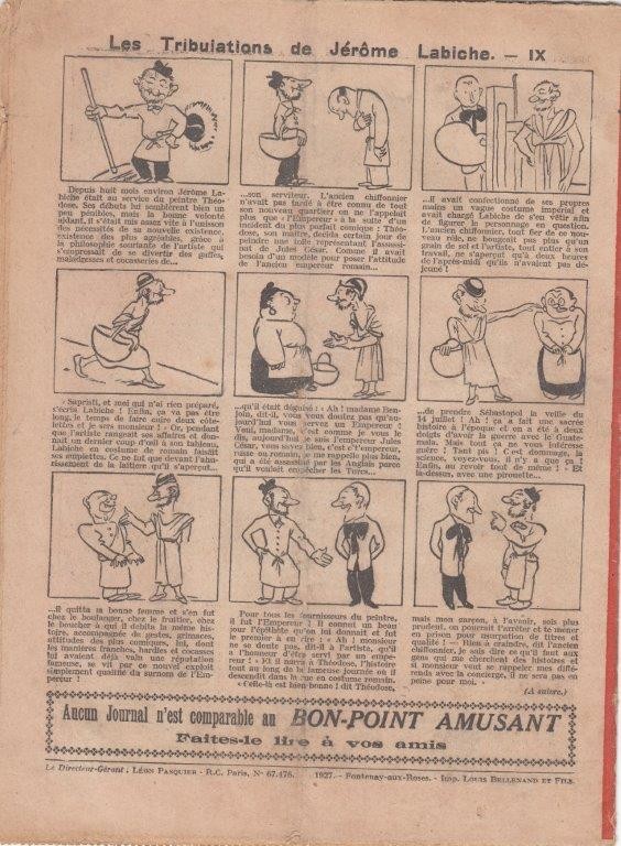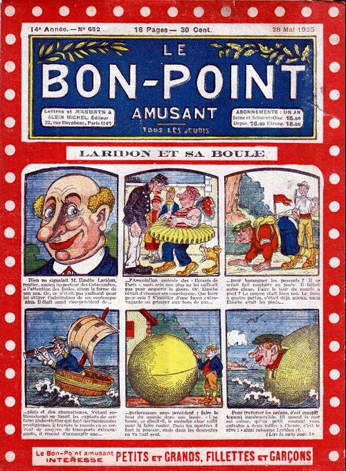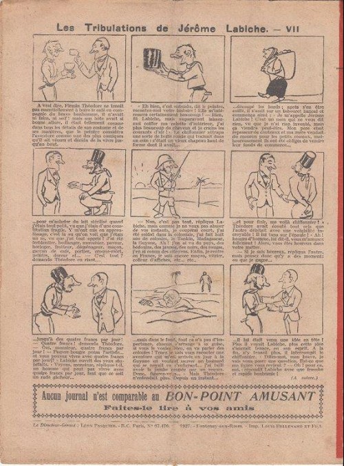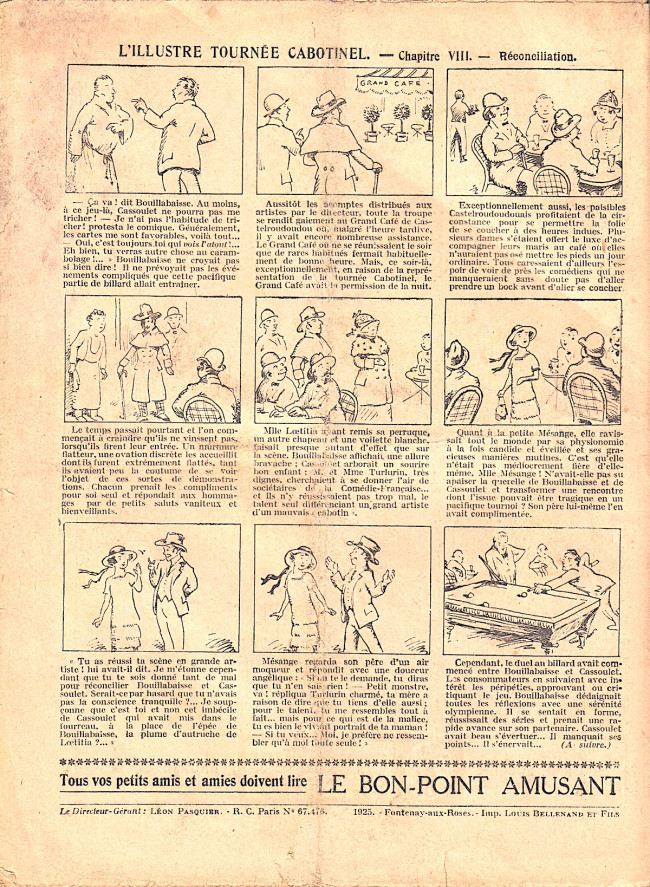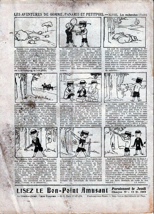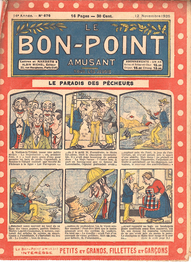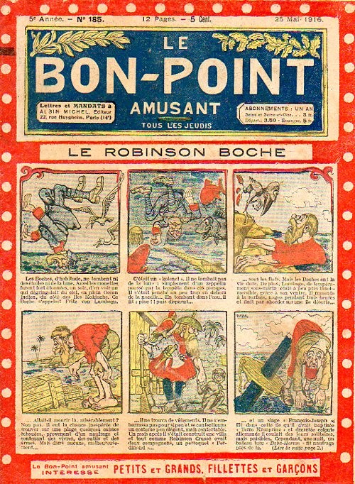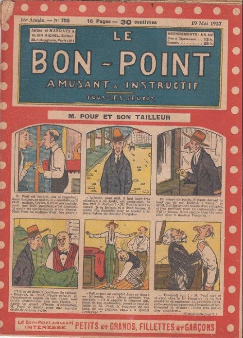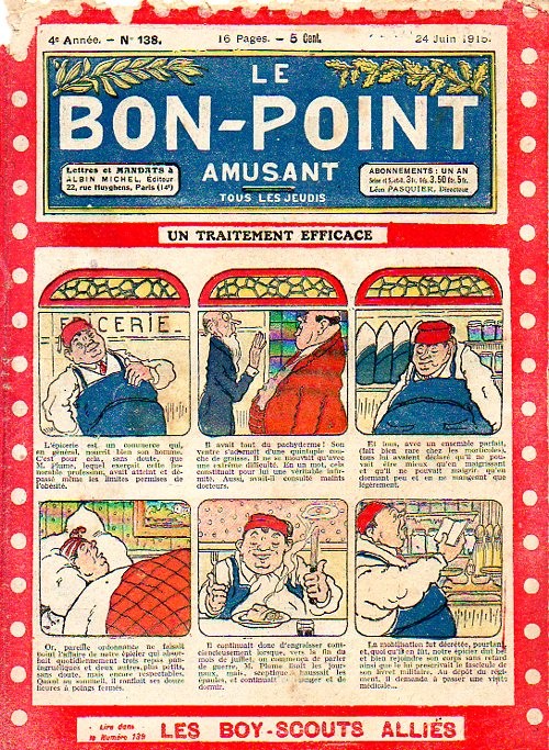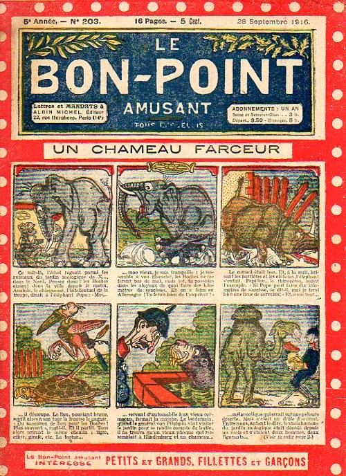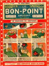 Sommaire : 04.07.1912 (n°1) au 16.06.1938 (n°1333) Le Bon point amusant, qui deviendra secondairement « et instructif ! » est une petite revue hebdomadaire pour enfant créée par Albin Michel en 1911. Le récit : Un Tour du monde en aéroplane, écrit par le Comte Henri de la Vaulx et Arnould Galopin, est paru en feuilleton dans ce périodique. Ce périple a un tel succès qu’il devient ensuite un livre de lecture courante, illustré de six cent trente dessins de Fillol et encore publié en 1928. Arnould Galopin, auteur apprécié du journal, publie encore dans Le Bon point amusant, Le Petit Mousse (1928) ou bien, Aventures d’un Petit Explorateur, en 1934, quatre ans avant la disparition de l’hebdomadaire remplacé par le magazine Francis, publication éphémère qui échoue dans ses tentatives de modernisation. À noter le trés fort caractère propagandiste. (les titres sont notés tels quels) n°131 : - La bienvenue du conscript. - Gringalet (grand roman dramatique inédit par Pierre Guillon). - Initiative d'un jeune poilu. - Jacques, l'enfant trouvé. - Dans les ténèbres. - Red Fly, le cow-Boy rouge, par Teddy Smith. - Histoire des nez. - Petit Soldat de la Grande Guerre. Roman héroïque par Blanche Petithuguenin. - Page patriotique : L'espion brocanteur. - Til l'Espiegle XXXV. Hue Cocotte.
