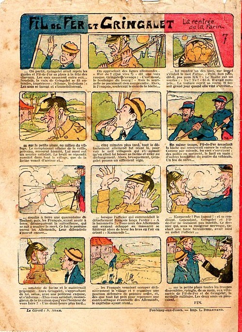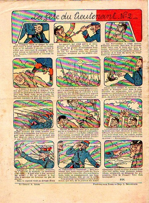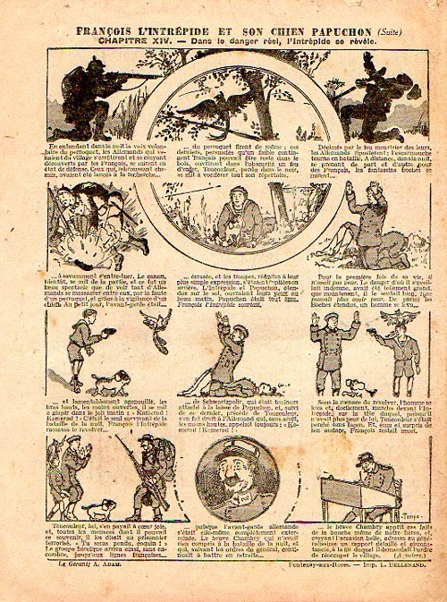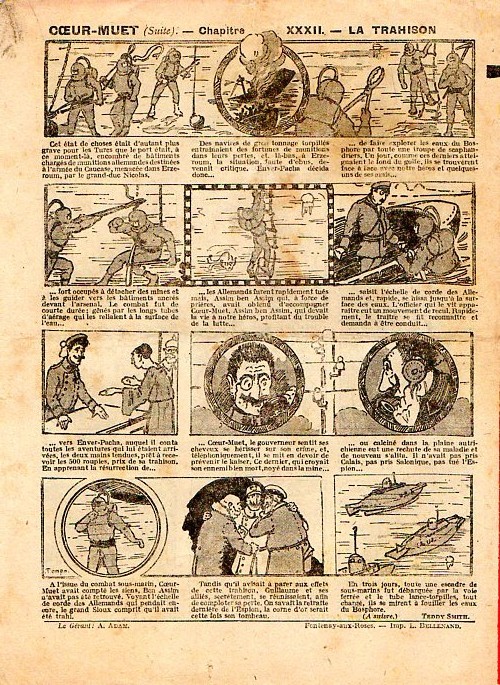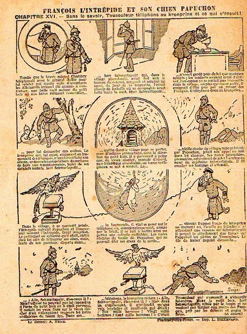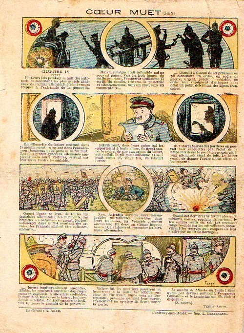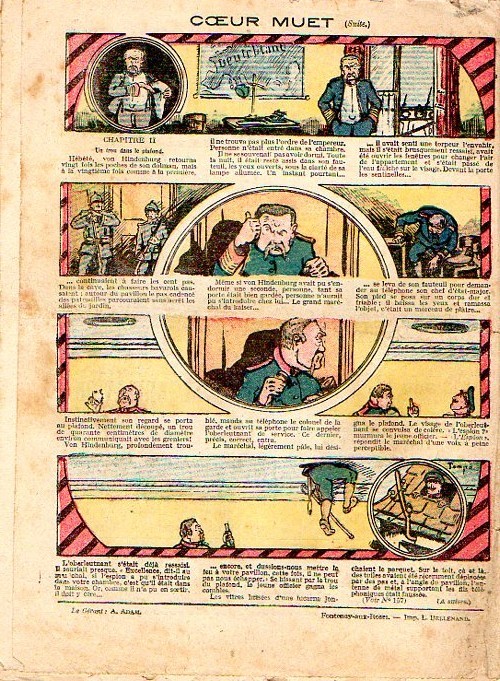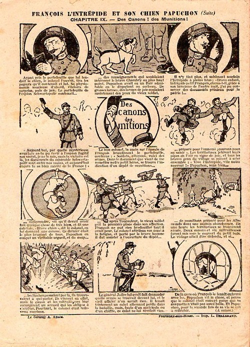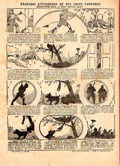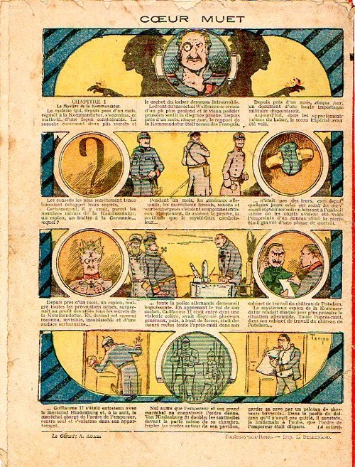 Sommaire : - Von Pindepitz débute au théatre. - Singulière capture ! - Gringalet (grand roman dramatique inédit par Pierre Guillon). Chapitre LXXI. Gringalet ne "s'en fait pas" ! - Toto veut un... boche ! - Le singe. - Jacques, l'enfant trouvé (troisème partie). XXI. L'apparition ! - Culture contre "kultur" : les boys-scouts alliés. Le roman de la jeunesse héroïque, par Marc Croizilles. Chapitre XXXI. Les quatre fous de Brendingen. - Les housards de la revanche. Chapitre XXXII. Le plan de Jean. - Les housards de la revanche. Chapitre XXXIII. Le bouton fatal. - Petit Soldat de la Grande Guerre. Roman héroïque par Blanche Petithuguenin. Deuxième partie. Chapitre XVII. Auprés d'un mourant. Chapitre XVIII. Nouveau deuil. - Le salut au drapeau. - Coeur-muet. Chapitre XXVII. L'Aventure du Crieur de journaux. par Teddy Smith.