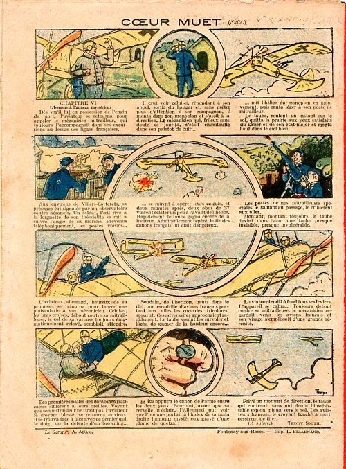 Sommaire : - L'avion blessé. - Le rhume de Jolibois. - Gringalet (grand roman dramatique inédit par Pierre Guillon). Chapitre XLVIII. Duel de monstre. - Invisibilité. - Jacques, l'enfant trouvé (deuxième partie). XXXII. Le faux soldat. - L'exploit de Fanfan. - Petit Soldat de la Grande Guerre. Roman héroïque par Blanche Petithuguenin. Chapitre XLVI. Etienne aviateur. - L'idiot. Coeur muet. Chapitre IV. ?????. par Teddy Smith.