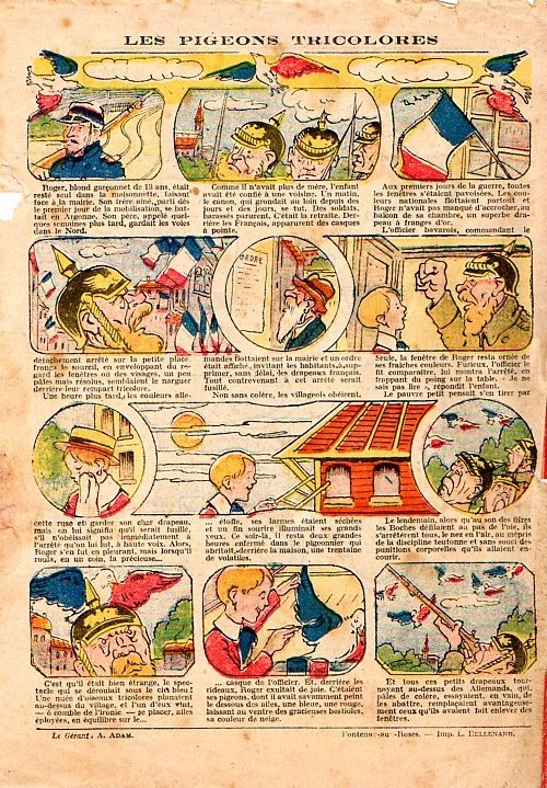 Sommaire : - Le drapeau. - Trop de zèle ! - Gringalet (grand roman dramatique inédit, par Pierre Guillon). Chapitre XXXVI. Combat aérien ! - Une ruse. - Jacques, l'enfant touvé (deuxième partie). XX. Le calvaire d'une Mère. - Culture contre "kultur" : les boys-scouts alliés. Le roman de la jeunesse héroïque, par Marc Croizilles. Chapitre VIII. L'Otage est mort, le Dossier est retrouvé. - Le Jeune Poinsel s'amuse. - Un poilu "à plumes". - Petit Soldat de la Grande Guerre. Roman héroïque par Blanche Petithuguenin. Chapitre XXXIV. Nos Alliés les Anglais. - Les exploits de Dick (histoire vraie). - Les pigeons tricolores.