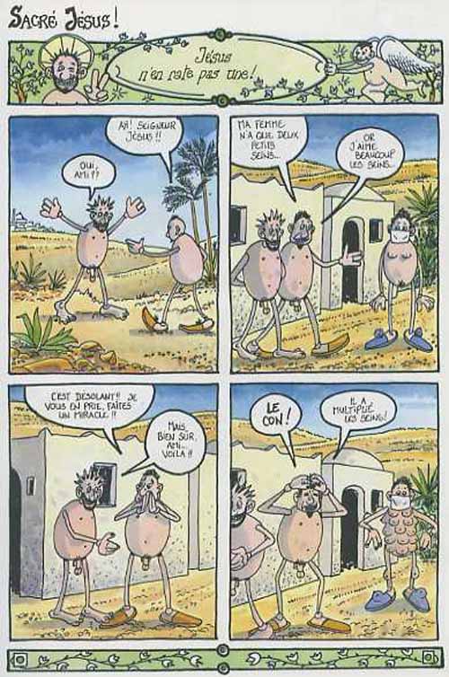 "Quelle erreur ! Jésus n'était pas ce sinistre raseur au sourire niais... L'ami christ, au contraire, était un jovial farceur, un bon vivant qui ne refusait jamais un petit verre d'eau (changée en vin !!)."