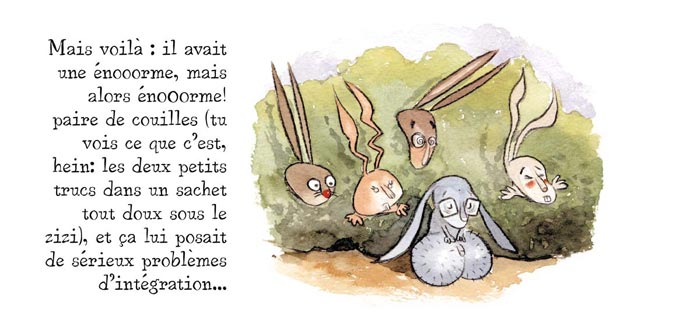 Henri, le lapin à grosses couilles est un faux vrai livre pour enfants (et non l’inverse). Hilarante fable sur un petit lapin à lunettes -qui se fait moquer par tous les animaux de la forêt du fait de sa paire de testicules totalement disproportionnée- qui deviendra un héros dans sa petite communauté animalière en sauvant Heliette, petite lapine cul de jatte suite à un accident de chasse (enfin, on se comprend). On pourra y voir, comme souvent dans les fables, une parabole dont le thème est, on s’en serait douté, un plaidoyer pour le respect des différences. Dans un pur style “il était une fois”, Henri le lapin à grosses couilles sait faire rire les grands (parents ou pas) par le pastiche qu’il propose sur la sage (et souvent niaise jusqu’à l’injure) littérature enfantine, et bidonne de rire les marmots (nous avons fait des tests !) par l’approche originale de la thématique qu’il propose.