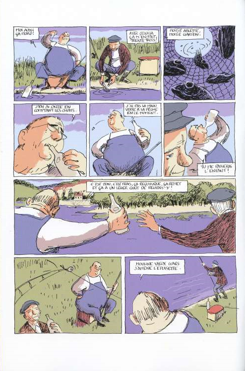 Chaque jour, Edmond et Pierre, deux petits vieux (ou deux "seniors", pourront dire les plus ancrés dans la modernité), s'installent au bord de la rivière pour pêcher. Ils font de temps à autre des pauses pour casser la graine ou boire un coup de blanc. Parfois ça mord un peu...