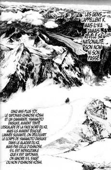 Le sommet du K2 n'a jamais été atteint à partir de sa face nord. C'est pourtant par cette voie, réputée inviolable, que choisit de grimper le jeune Nawan Door, fils d'un magnat du pétrole. Mais, lorsqu'il chute à quelques mètres du sommet, qui pourrait le secourir ? Un seul nom vient à l'esprit des sherpas : K ! On le surnomme K, mais personne ne connaît ni son vrai nom ni son passé. K vit avec la montagne, il est même capable d'entendre la voix... la voix des dieux ! Pourra-t-elle le guider ?! Jirô Taniguchi, le maître du dessin, déjà captivé par la montagne et ses héros, sept ans avant le Sommet des dieux, retranscrit avec maestria l'univers des cimes ! Ce one-shot est une magnifique approche de la montagne à la fois fascinante et dangereuse.