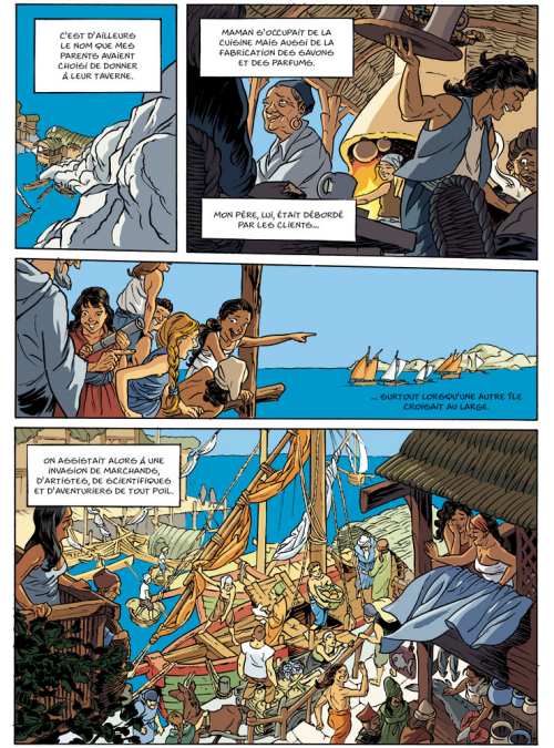 Papille a grandi dans le tumulte d'une taverne, située sur le tribord de la dérivante de Bourne. La jeune fille troque ses talents pour la peinture contre des histoires sur les îles lointaines tout en aidant sa mère Ama qui, malgré une jambe de bois, trime sans relâche depuis le départ de son mari pour la guerre un an plus tôt. Elles restent sans nouvelles de lui et doivent désormais supporter la présence de son misérable frère, le bourgmestre de la ville, qui veut reprendre la taverne et épouser Ama contre son gré. Lors de la soirée de fiançailles, Ama drogue tous les convives et s'enfuit avec sa fille chez sa soeur qui vit de l'autre côté du lagon. C'est le début d'un long périple pour Ama et Papille, qui pourra vérifier d'elle-même les dires de ceux qu’on appelle les Mériliens, les grands voyageurs !
