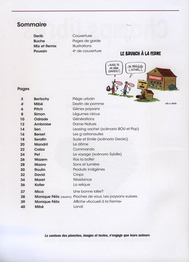 Couverture : Derib. 4ème de couverture : Poussin. Pages de garde : Buche. Illustrations : Mix & Remix et Mica. Planches originales : Ambroise, Berset, Bertchy, Calza, David, Koller, Mandril, Maoro, Maret, Mibé, Odrade, Pet, Pitch, Roulin, Sen, Serafin, Simon et Wazem . L'album comprend 2 pages illustrées d'information sur le monde paysan.