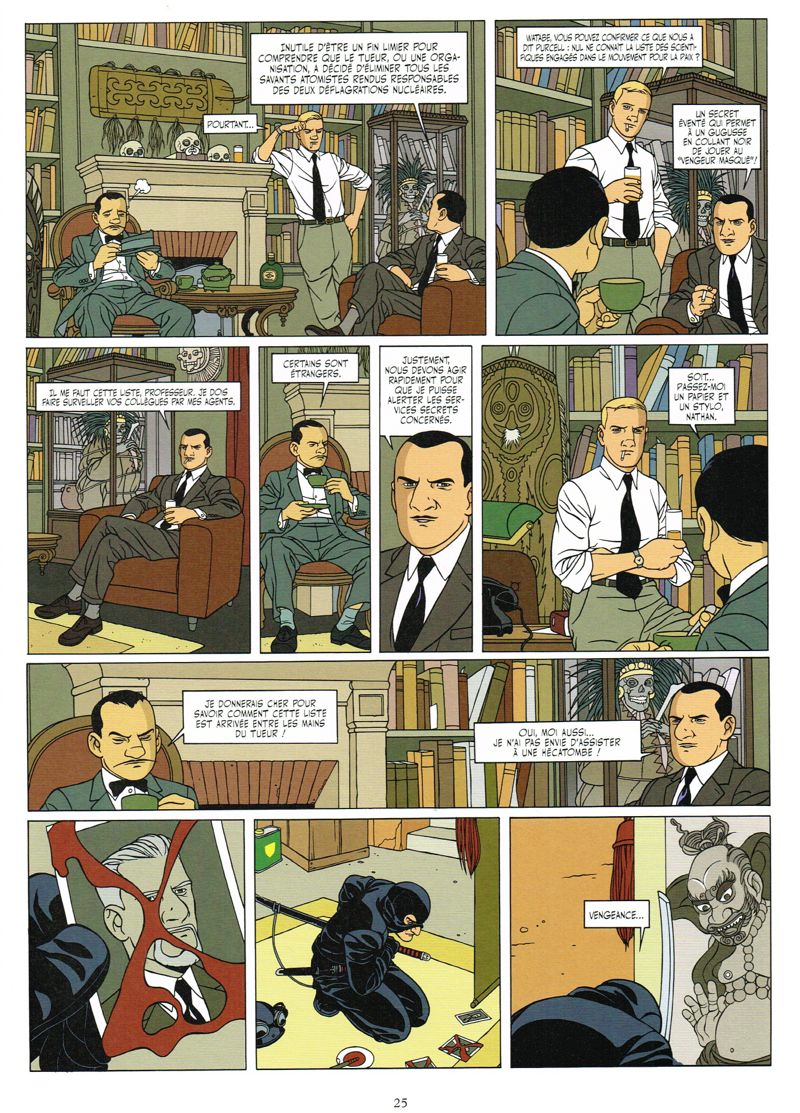 Une série éblouissante, dans la grande tradition du feuilleton policier d'aventures, portée par un Convard au sommet de son art et un Thibert s'imposant définitivement comme le nouveau maître de la Ligne Claire moderne. Le scientifique Jason Purcell est un homme brisé. Mais un homme debout. Car depuis la mort de son compagnon de recherches, Albert Bernstein, Purcell reste le seul responsable des abominations d'Hiroshima et Nagasaki. Dévoré de culpabilité, l'homme a décidé de créer un comité de lutte contre la prolifération des armes atomiques. Initiative louable, mais dangereuse, puisque Purcell est aussitôt assassiné par d'ignobles tueurs, capables d'étrangler leurs victimes à mains nues, mais aussi d'escalader les façades d'immeubles à la seule force de ces mêmes mains... De quoi titiller la curiosité d'un couple d'enquêteurs pas comme les autres : Étienne Kaplan, membre des services secrets français, et Nathan Masson, scientifique réputé. L'enquête peut commencer. Elle sera étourdissante d'action, de rebondissements, mais aussi d'intelligence. Portée par le sublime graphisme de Thibert, mêlant le meilleur des années d'or de la Ligne Claire à une rythmique narrative purement contemporaine, Les Aventures de Kaplan et Masson constitue tout simplement la nouvelle série événement de Didier Convard depuis Le Triangle secret. Déjà une référence.