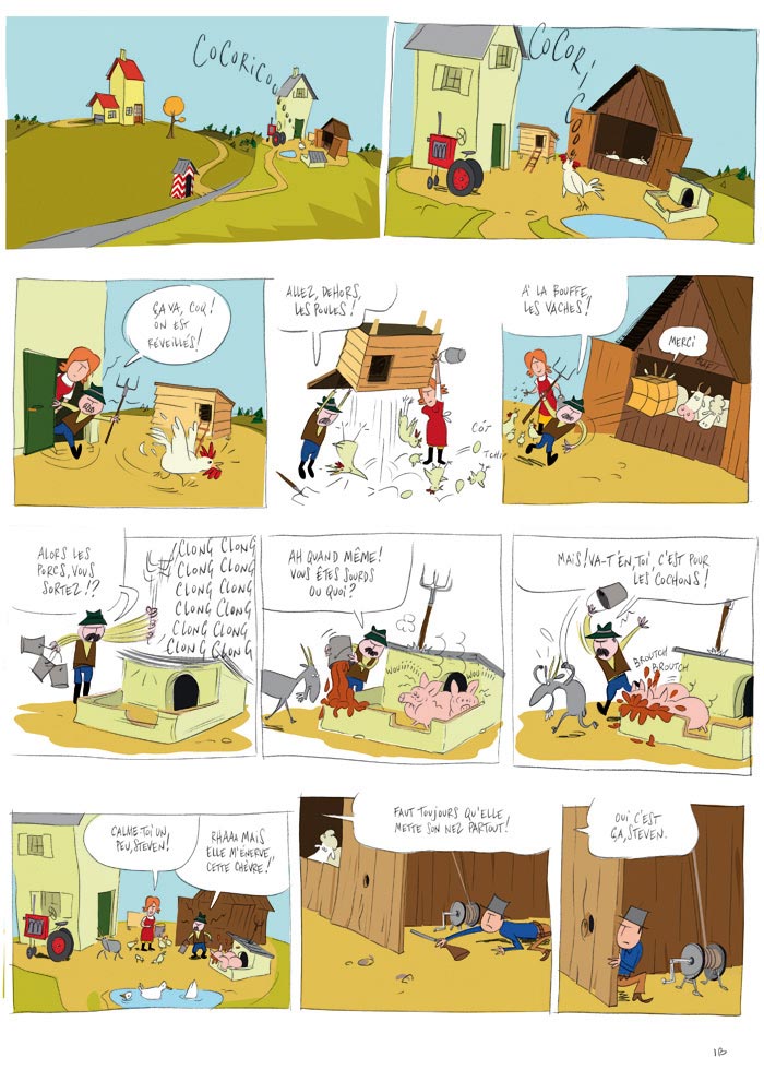 L'album raconte quelques chapitres de la vie de : Cheval, le gentleman-farmer ; Indien, qui n'a aucun sens de l'orientation, qui est peureux et qui n'a qu'une obsession : voler le tracteur de Steven ; cow-boy, qui a un jour ingurgité un morceau de météorite qui l'a transformé en Cob'Hulk; Steven (à l'écran, Steven a la voix de Benoît Poelvoorde) le fermier qui ne mange que du cochon acheté en tranches au supermarché et qui est capable de terribles colères (surtout quand on lui pique son tracteur), et Jeannine, passionnée de peinture contemporaine, qui n'a pas son pareil pour tartiner ses biscottes au cochon entier...