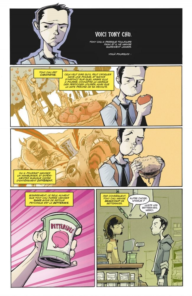 L'inspecteur Tony Chu possède un don pour le moins étrange : il est cibopathe. Cela signifie qu'il est capable de retracer psychiquement la nature, l'origine, l'histoire, et même les émotions, de tout ce qu'il mange. Ce qui ne l'empêche pas d'être aussi un policier tout à fait respectable... lorsqu'il ne goûte pas à la victime d'un meurtre afin de découvrir l'identité du coupable et ses motifs.