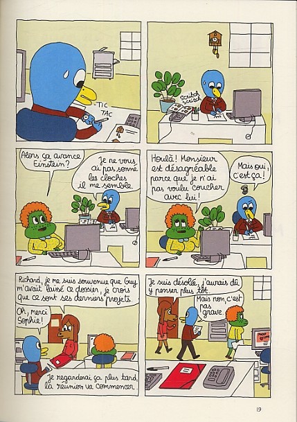 Pour être embauché chez Coucous Bouzon, spécialiste sur le déclin du coucou suisse, Richard a dû répondre à la question « arrivez-vous à toucher vos pieds jambes tendues ? » puis saluer Kiki, le poisson mort. Et il n'y a pas que le patron qui soit bizarre, tous les collègues sont spéciaux. Réunions inutiles, rétention absurde d'informations, harcèlement sexuel... la vie ordinaire de l'entreprise prend ici des aspects singuliers... et carrément flippants ! Le pauvre Richard est tombé chez les fous et il n'est pas certain qu'il sorte indemne de la boîte à coucous.