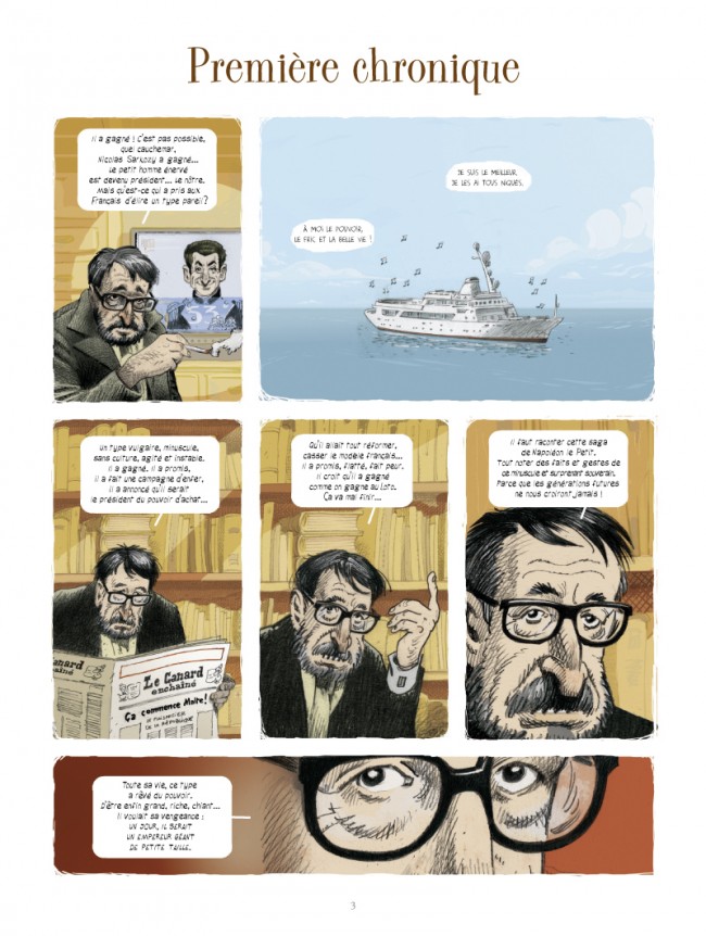 « Il a gagné ! C'est pas possible… Ce type vulgaire, minuscule, sans culture, agité et instable est devenu président… » Afin de ne pas se laisser aller à la dépression à l'annonce d'un tel fiasco national, Patrick Rambaud, de l'Académie Goncourt, s'est mis pour notre plus grand plaisir à écrire ces Chroniques. Un journal intime et excédé de toutes les extravagances, invraisemblances, imbécillités, dérapages et enfumages qui ont suivi l'accession au trône de Nicolas Sarkozy. Des petits bijoux d'observation, d'humour et de colère, dans une écriture fleurie et incisive, qui s'amuse à jouer sur les ressemblances troublantes entre le règne présidentiel de Sarkozy et celui de l'Empereur Napoléon... Au dessin, Olivier Grojnowski s'approprie avec malice les traits des figures les plus clinquantes qui forment sa cour : le Duc de Sablé, la Baronne Dati, le Cardinal de Guéant, et bien sûr, les Impératrices successives ! Un tableau jouissif et pitoyable de la tête du pouvoir. Cet album est un florilège des meilleures chroniques issues des cinq recueils publiés aux éditions Grasset.
