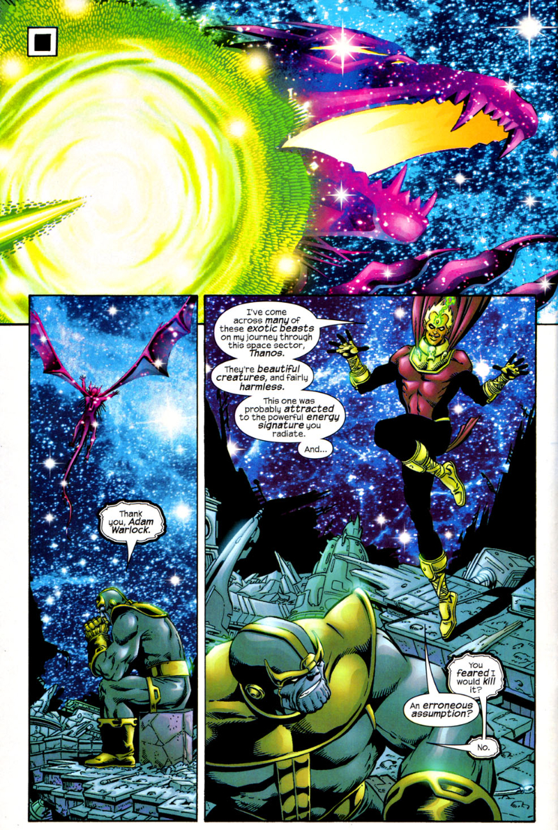 After the events of Marvel: The End, Thanos flashes back over his life to decide upon his future, with perennial friend/foe Adam Warlock. Thanos decides to make up for the destruction of Rigel 3 at the hands of one of his doppelgangers (called Thanosi) by surrendering to the Rigellians.