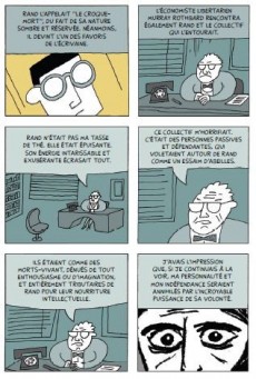 Après la science (« Fables Scientifiques ») et la maladie mentale (« Fables Psychiatriques »), Darryl Cunningham se penche sur les relations entre la politique et l’économie, et plus précisément sur l’évolution des doctrines libérales et leur rôle dans le déclenchement de la crise de 2008, puis de la montée des extrêmes droites en Europe. Dans un premier temps, Cunningham brosse le portrait d’Ayn Rand, auteure américaine, - notamment de « La Grève » - relativement peu connue en France mais qui a été extraordinairement influente aux États-Unis. Ayn Rand est à l’origine de la doctrine de l’objectivisme et a influencé de très nombreux hommes politiques américains, dont les libertariens, mais aussi des personnes clés de l’administration qui jouèrent un rôle prédominant au moment de la crise de 2008. Cunningham décrit également dans le détail les mécanismes en cause dans cette crise et les ravages qu’elle a causés, parallèlement à un nouvel essor des politiques libérales et à la montée de l’individualisme dans nos sociétés. Son engagement est sans équivoque et il annonce clairement la couleur dans sa préface : "Dans des États démocratiques, où le droit de vote existe, nous sommes responsables d’avoir donné le pouvoir à ceux qui estiment vertueux de privilégier l’amoncellement d’argent au lieu de l’égalité de tous."