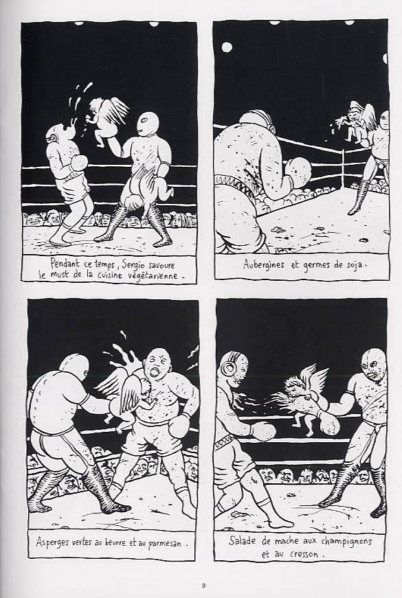 Sergio est boxeur. Il est aussi végétarien. Sur le ring, c'est le roi. Grâce à deux petits anges gardiens qu'il utilise comme gants de boxe, il ne laisse que peu de chance à ses adversaires. Adulé, il mène une vie de plaisirs, de fruits et de légumes. Cependant, lors de vacances, c'est le drame ! Ses anges gardiens sont dévorés par des Requins et ç'en est fini du ring et de la grande vie pour Sergio. Heureusement, il lui reste les légumes. Quentin Faucompré est nantais et participe régulièrement au magazine Ferraille illustré. Dans ce nouvel opus la collection comix, il nous propose un conte simple, redoutablement efficace et toujours empreint d'humour décalé.
