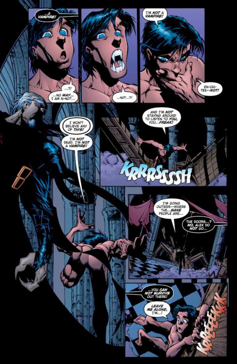 Crimson revolves around a young man named Alex Elder who is attacked by a gang of vampires while out late with his friends. Bitten, Alex is saved by Ekimus, the last of an ancient race pre-dating humanity, who claims Alex is "The Chosen One." Alex becomes the first and last of his kind, gaining powers beyond that of a normal vampire, who is destined to bring the end to vampirekind. The series follows Alex as he adjusts to life as a vampire and shoulders the responsibilities of being chosen. The comic features not only vampires, but werewolves and other supernatural beings and elements, as well as Biblical themes and deities.