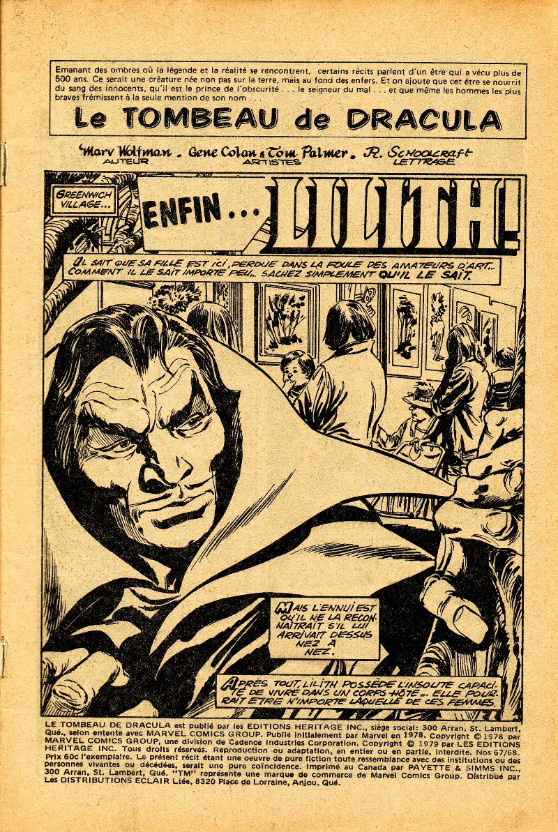 Edition en canadien français, en format comics et noir et blanc, par l'éditeur Héritage de la fameuse série TOMB OF DRACULA (Marvel comics).