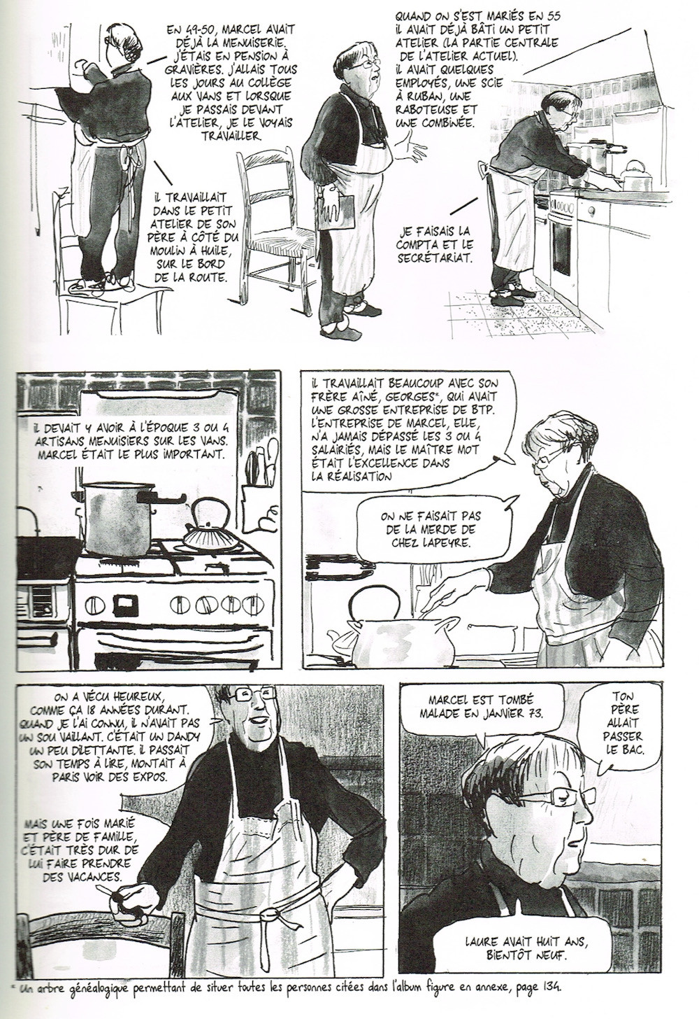 Aurel est retourné dans son village d'enfance et a suivi et interrogé son père, les ouvriers et les clients de la menuiserie, mais aussi sa grand-mère, qui continue de recevoir son fils toute les semaines à déjeuner, dont les menus agrémentent le livre et feront saliver le lecteur.